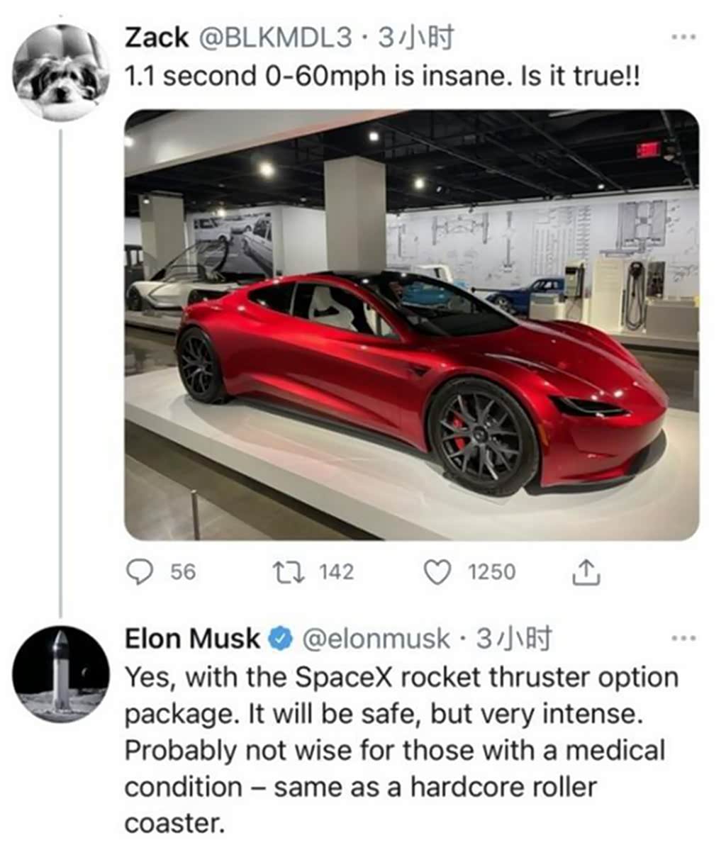 有国外网友在社交平台上向特斯拉CEO埃隆·马斯克对这样惊人的加速度进行求证,得到了本人的证实。并且,随后马斯克也评论称,这款车的量产版本看起来会更棒。这款车是绝对安全的,但驾驶起来会非常激烈,对于那些有健康状况的人来说可能不太适合。