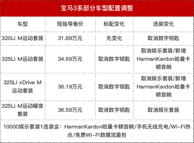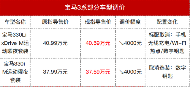 宝马330系列车型售价也进行了调整,宝马330Li xDrive M运动曜夜套装版车型,调整后售价40.59万元,同时取消了手机无线充电、Wi-Fi热点以及数字钥匙配置;宝马330i M运动曜夜套装调整后售价37.59万元,并取消选装数字钥匙配置。以上车型分别下调4000元。