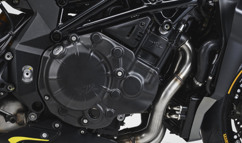 引擎也与MV Agusta其他车款相同,针对腹内修改以符合Euro 5认证规范,998 c.c.四缸引擎可爆发出208hp@13,000rpm、11.9kg-m@11,000rpm性能表现,极速拥有超过300km/h实力,为了对应大动力输出,2021年版本中电控系统也获得更新,新软体与IMU让循迹、起步弹射、弯道ABS等表现更细腻,快排感应器也换上新产品,让运作更流畅。
