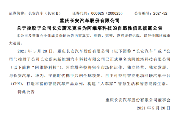 5月20日长安汽车发布公告信息披露,公司控股子公司长安蔚来新能源汽车科技有限公司已正式更名为阿维塔科技(重庆)有限公司(以下简称阿维塔科技),其独立上市的计划也在推进中。