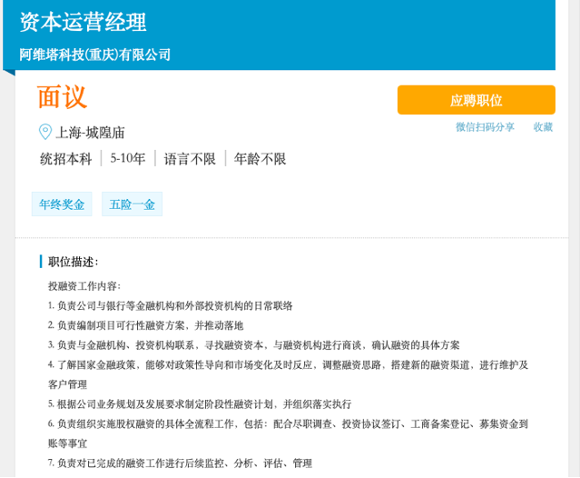 其中,“投融资总监”的任职要求明确提出了需要5年以上投融资经验,有知名投资银行、券商、PE、VC、FA任职经历的优先,有过主导/辅助公司整体上市的全流程经验的优先。