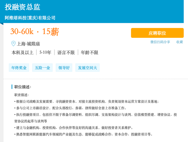《车壹条》在某招聘网站看到,阿维塔科技发布了“投融资高级经理”、“投融资总监”、“资本运营经理”等热招职位,所属部门为资本运营部和战略部,给出的薪酬是“投融资总监”30-60k,“投融资高级经理”30-40k,均为15薪 ,粗略计算,年薪最高接近百万。