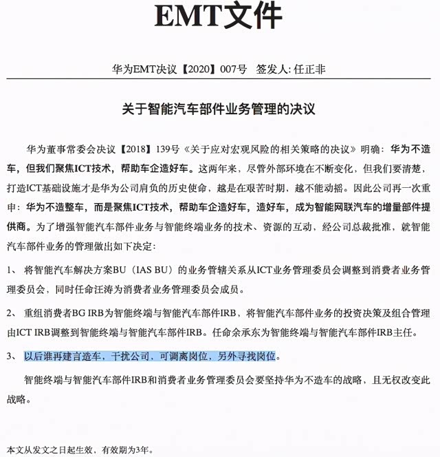 其实早在2018年华为董事会就发布了一份决议,139号《关于应对宏观风险的相关策略的决议》明确:华为不造车,但我们聚焦ICT技术,帮助车企造好车。2020年华为再次发表文件,2020 007号文件,签发人任正非。公司再次重申不造整车,帮助车企造好车,成为智能网联汽车的增量部件提供商。