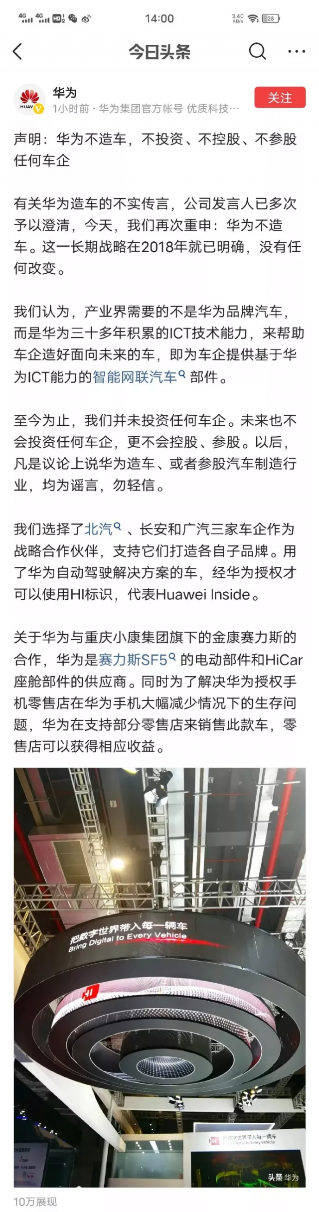 没有参与投资任何车企,支持他们打造各自子品牌,另外就是重点重申了跟赛力斯的合作,表明什么?北汽、长安和广汽三家车企作为战略合作伙伴,用了华为的自动驾驶方案才能授权使用HI标识,解释,不是他们所有的车是都Huawei Inside。第二个就是跟赛力斯的合作,是在手机大幅减少情况下为解决生存问题在授权手机零售店为赛力斯卖车,零售店获得的相应受益。看得出来华为是在极力撇开跟这些车企的关系。