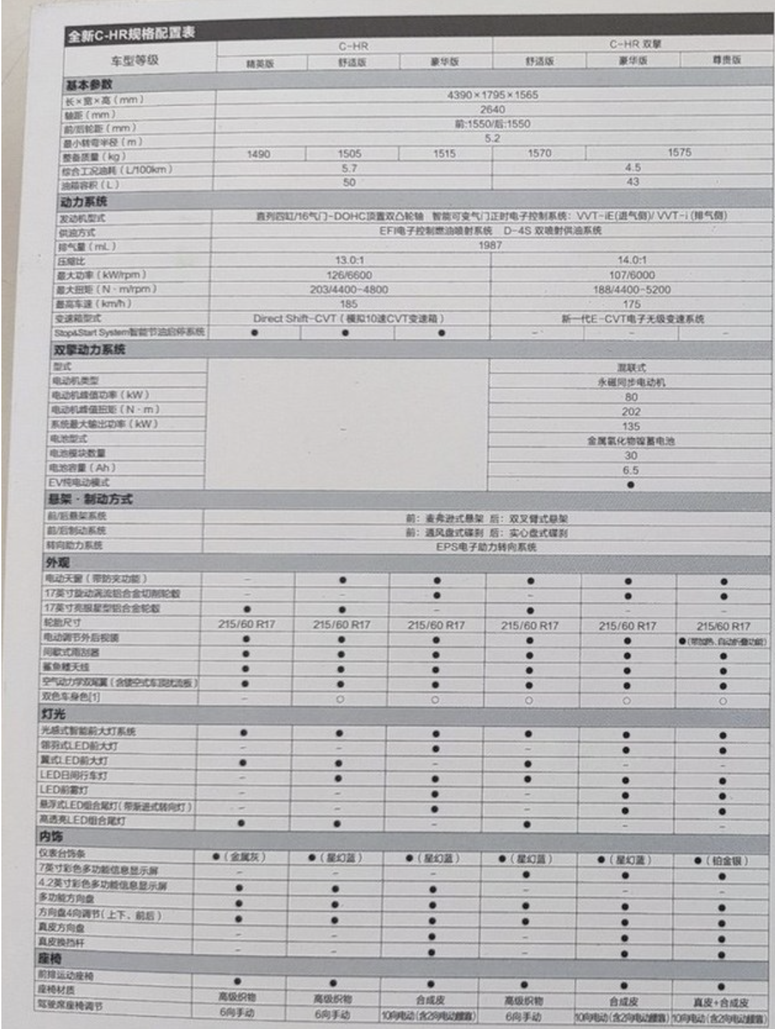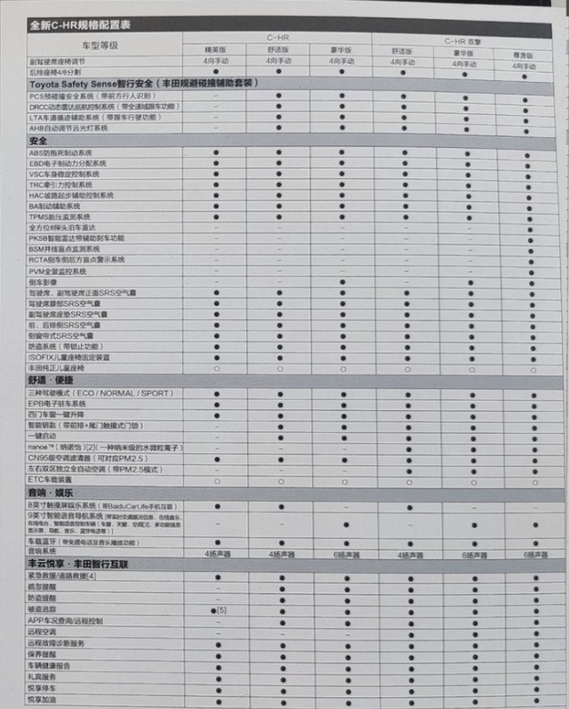 日前,有网友曝光了一组疑似新款 广汽丰田C-HR的配置信息。从信息来看,新款C-HR或将分为6款车型,其中燃油3款双擎3款,燃油3款较现款的5款车型有所减少,除了最低配的精英版之外的车型都标配TSS丰田智行安全系统,包含预碰撞安全、车道循迹辅助、动态雷达巡航控制等;并且ABS\EBD\VSC\TRC\HAC\BA\TPMS等都是全系标配。