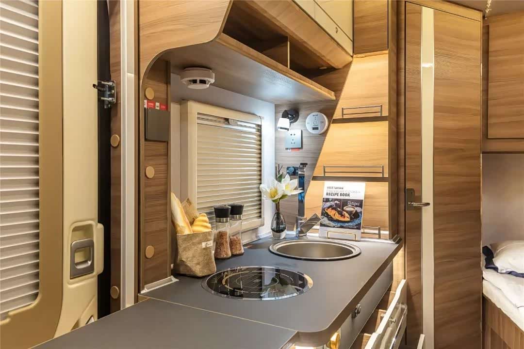 厨房区位于车厢中部,桌面上标配了功率为1200W的220v电磁炉,带盖式洗手池和高弯水龙头等;下方配有三组空间可观的抽拉式抽屉,可存放日常碗具及其它物品。厨房区可选配房车专用侧出风吸油烟机、家用220v微波炉(1500w)和2.5kg壁挂式洗衣机。安全配置方面,车内设有烟雾和一氧化碳报警器。