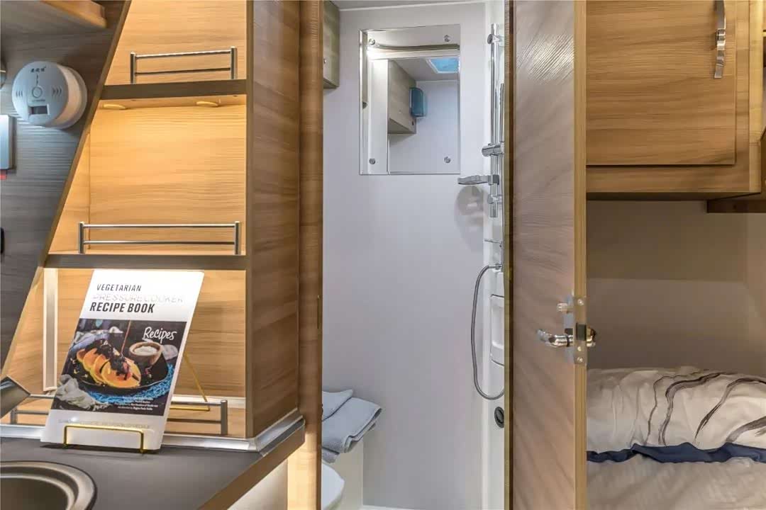 卫生间在厨房区右侧,干湿分离卫生间,使用起来更为方便。卫生间内标配了瑞典进口多美达抽拉盒式马桶,黑水箱18L,卫生间舒适洗浴系统,房车专用卫生间双向换气扇。水路配置方面,新车标配房车专用快插式水路管件及带前置过滤器的房车专用隔膜水泵;饮用级别净水箱容积180升,灰水箱50升。