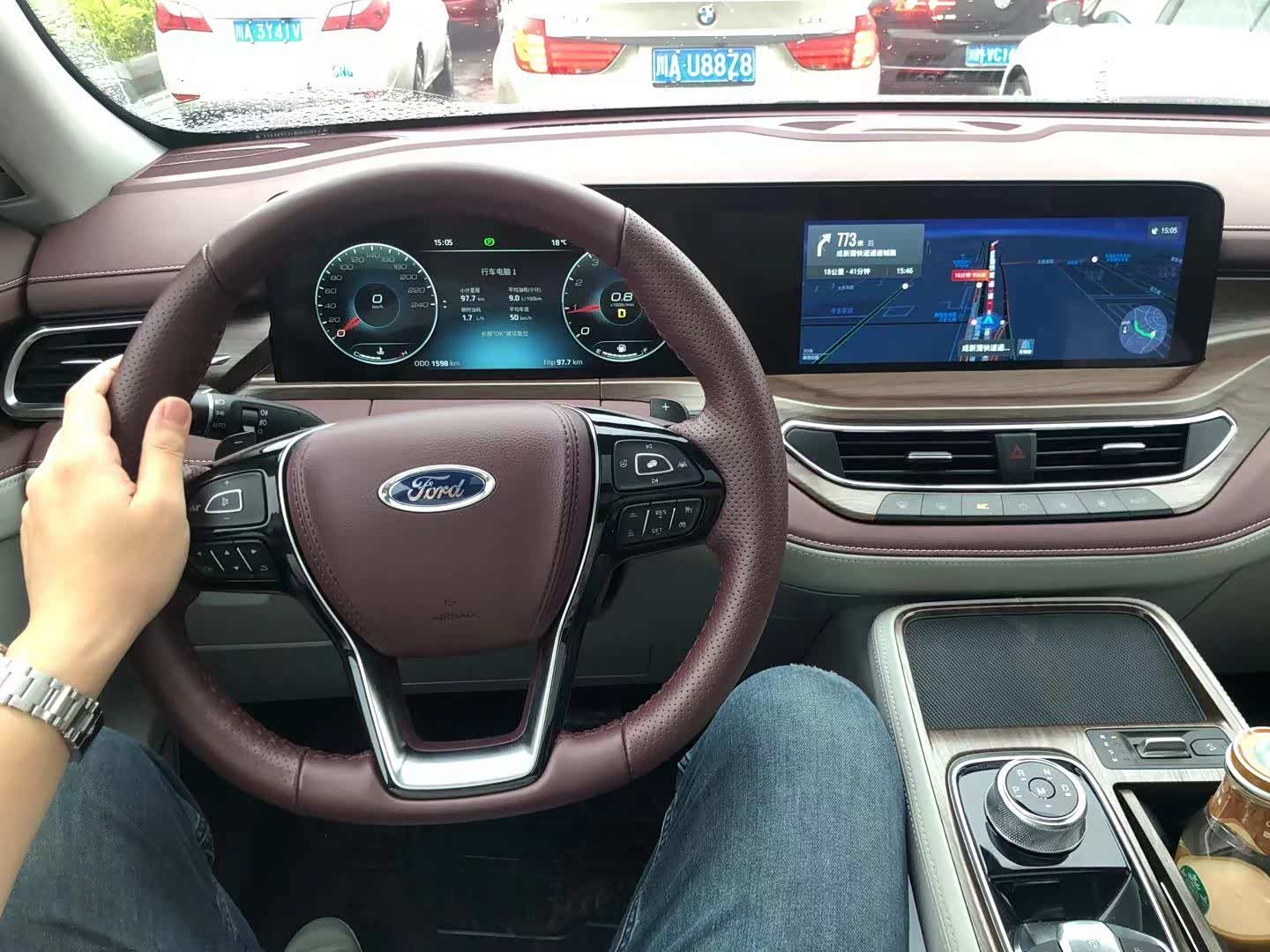 动力方面,福特领裕全系搭载了2.0T+6DCT动力总成,这台2.0T涡轮增压发动机最大马力224ps,峰值扭矩360N·m,参数表现比大众EA888-DKX高功率版本2.0T发动机更优秀。当然,发动机数据只能当作参考,实际动力表现还要考虑与变速器匹配、传动效率、整备质量、轮胎、风阻等一大堆因素。好在福特领裕这个大家伙并没有因为庞大的身材而变得不堪重负,实际动力表现还是不错的。具体来说,前段动力来得比较灵敏,无需大脚油门车子也会很聪明地窜出去。中段加速降挡反应够快,超车不拖泥带水。基于较大的整备质量和惯性,高速行驶动力储备也比较充沛。经过城市上下班高峰、城市畅通、郊区、高速等多种路况实测,福特领裕综合百公里油耗约为10.2L,还能吃#92“粗粮”。讲真,对于这个级别这个定位的SUV来讲,如此表现的确比较经济。