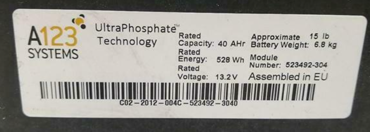 花了一些时间做调研以后,我发现这是一枚万向A123在捷克工厂做的电池。采用的是40Ah,标称电压为13.2V(可能是2P4S),用双端出Tap的方式来做的。