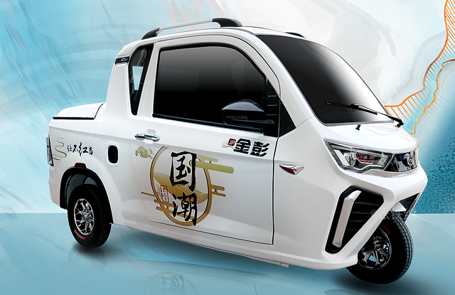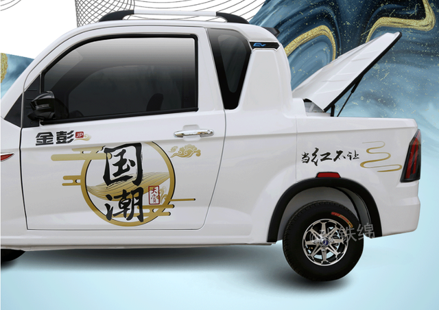 近日,金彭亮相了一款全新的封闭式驾驶室的三轮皮卡车,新车的外观设计非常抢眼。前脸部分,如果不看前轴的单轮结构,只看大灯和前杠部分的造型,很难相信这是一辆电三轮,大灯采用犀利的内切角造型,而且还使用了透镜结构,还带有LED日行灯,中网底部带有一条贯穿式的镀铬饰条。前杠两侧使用了运动轿车风格的较大进气格栅装饰,而且还带有竖条形的镀铬饰条,整个前脸非常帅气。