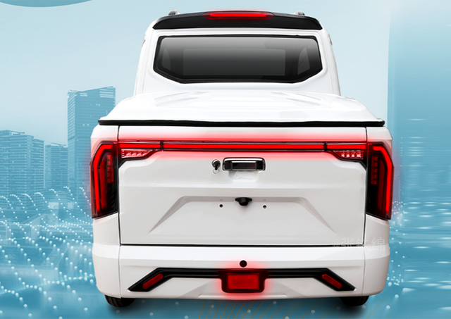 车尾部分的设计也是一大亮点,目前在正儿八经的皮卡车型中,使用的也大都是简单的单体式竖向尾灯,但是这辆金彭三蹦子版的皮卡却提供了目前在轿车上流行的贯穿式的尾灯设计,视觉效果非常炫酷。