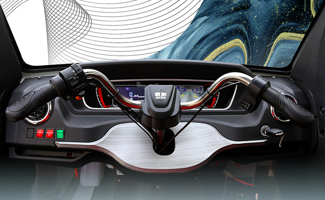 内饰部分,方向控制还是采用了传统的把手结构,但是仪表盘却是很有档次感的液晶屏,还集成了倒车影像功能,可谓是电动三蹦子界的猛禽了。