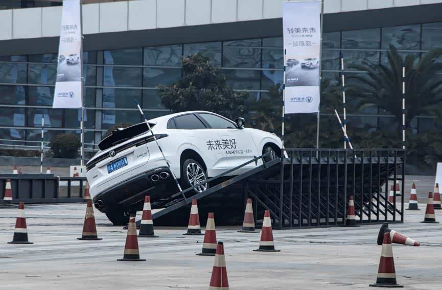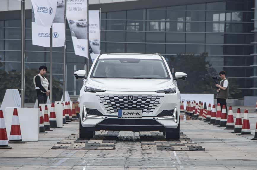 在周末的一次场地试驾中,让我有机会比较全面的体验了这台长安UNI-K。整个场地中共设置了起伏路、大斜坡、500mm涉水、连续减速带、直线加速、“8”字环岛以及关注度颇高的麋鹿测试,而在试驾环节中用到的全部车型均为四驱版车型。