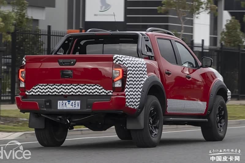 车辆侧裙和尾部均覆盖有伪装贴纸,预计为这个改装版的特殊贴纸拉花。从图片来看,改装版车型换装了定制轮毂,中心向内凹陷,间接的提升了轮距,预计轮胎尺寸也有变化。轮眉部分也有改动,改装版车型加入了铆钉,显得更有越野气息。动力方面,澳洲版全新纳瓦拉配备2.3T双涡轮增压柴油发动机,最大功率140kW,最大扭矩450N·m。传动部分匹配7速自动变速箱和6速手动变速箱。