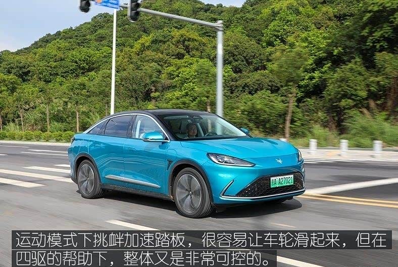运动模式下,加速踏板踩到底,四轮会伴随着短暂的滑移响胎,很快被抑制住,推背感很强烈。全力刹车,点头现象会比较明显,但考虑到它较高的离地间隙,足够长的悬挂行程能保证各种路面的通过性。