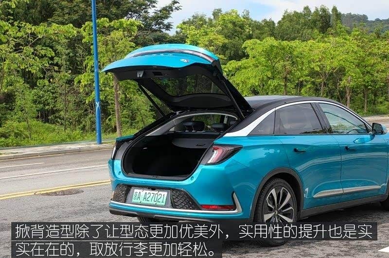车门把手采用了隐藏式设计,这已经是中高端纯电动汽车的标配了。该车采用了FASTBACK溜背设计,C柱一直向后延伸到了车尾边沿,形成了一个略微翘起的鸭尾。ABC柱和车顶都经过黑化处理,与车身主体形成了双拼色的效果。尾部非常厚重,站在车尾你能充分体会到这款车的“高”。尾灯采用了左右贯穿式设计,两端是较为锐利的箭头造型,为它增添了几分的运动气质。