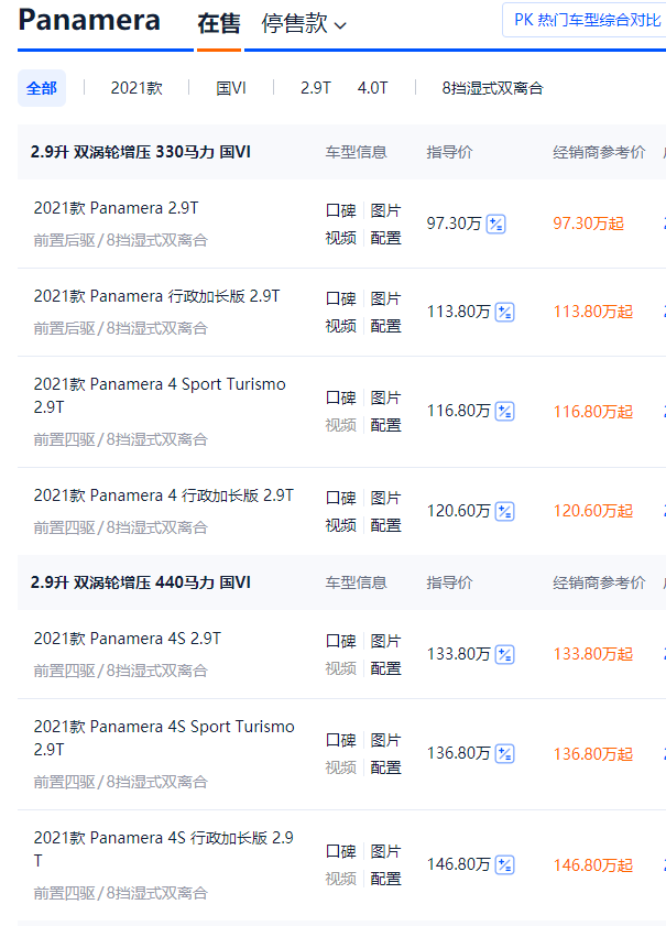 帕拉梅拉的厂商指导价97.30-245.80万,那既然标榜“有为青年”,总不能入手个丐版吧,所以咱们折中选择2021款的Panamera 4S车型,指导价133.80万,搭载440匹马力的2.9T V6发动机,破百时间4.3秒!这动力无论是上街买菜,还是赛道飙车,都妥妥地够用了。