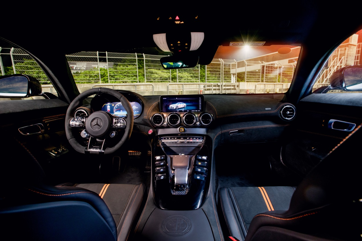 AMG GT Black Series的内饰以黑色调为主,亮点在于橙色的点缀、大量碳纤维和Alcantara材料的使用,平底方向盘的手感也非常棒。