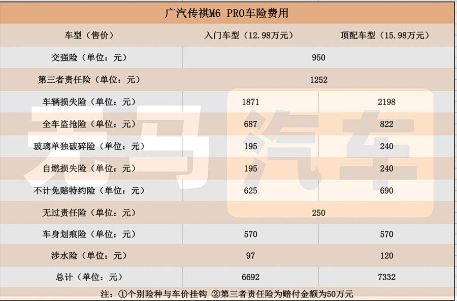 目前传祺M6 PRO共计推出4款车型,售价区间为12.98-15.98万元,而个别险种又是和车价挂钩的,所以经过计算,传祺M6 PRO入门车型的保险费用为6692元,顶配车型的保险费用为7332元。当然,如果没有出险的话,后续的保险是会逐年下降的,因为这里计算的是全险,所以会比较贵一些,我们就姑且先算传祺M6 PRO每年的保险费用为6692元。