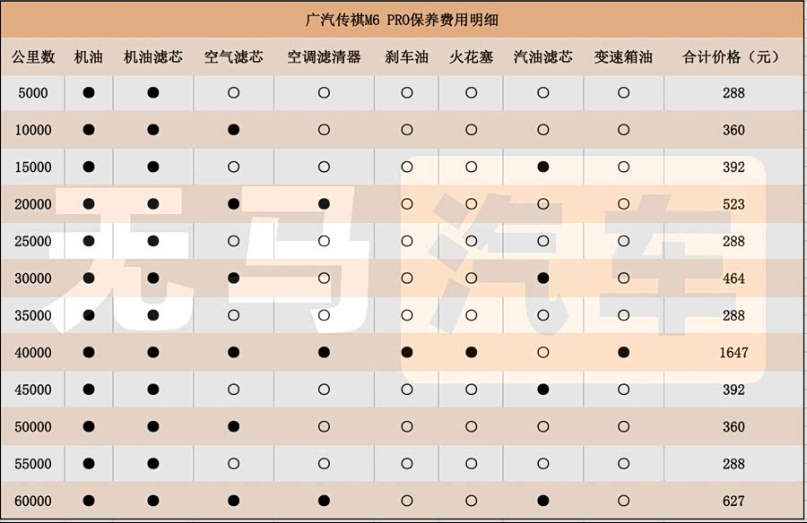 不过 传祺M6 PRO是每5000公里进行一次保养,相对来说保养间隔还是比较频密的,所以总体来看其保养价格也会有所上升。传祺M6 PRO最便宜的一次小保养为288元,最贵的一次保养为1647元,按每年行驶20000公里来算的话,三年的行驶里程就为60000公里,总费用为5917元,平均下来每年为1972.3元。而需要注意的是这个价格是撇除买保养套餐或代金券的结果,如果你有上述两项优惠方式的话,保养的价格应该可以再压一压。