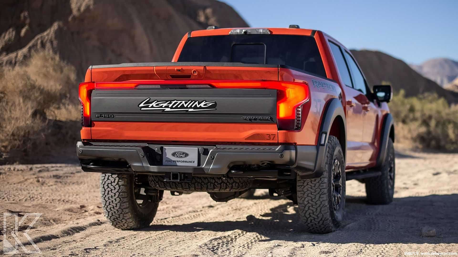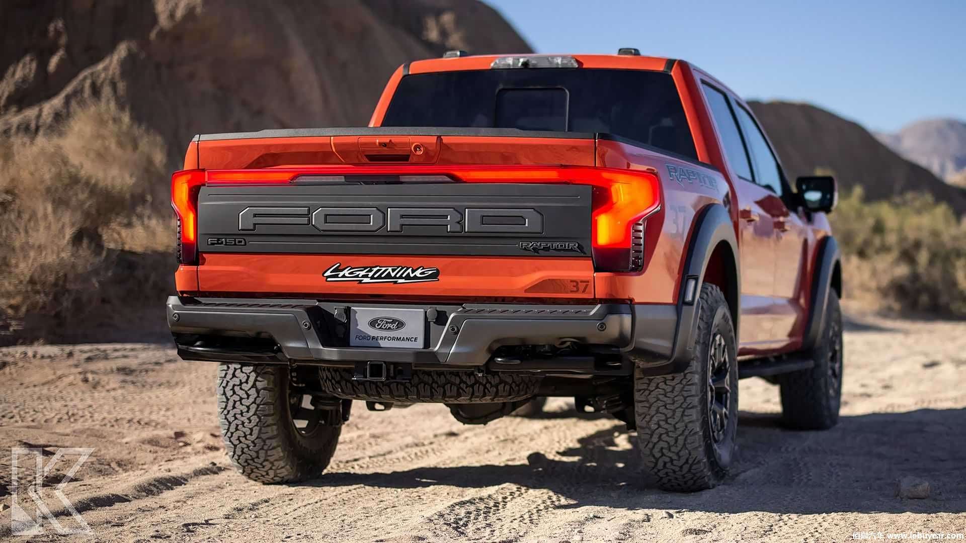 从渲染图中能看到,猛禽版Lightning在其设计上与常规的汽油动力F-150 的相似程度。两者非常相似,这使得创建闪电猛禽变得轻而易举。Lightning 前后饰板上醒目的照明图形与 Raptor 坚韧的越野美学完美契合。卡车的后面有醒目的闪电徽章,不过,就像普通的照明一样,后面可能有太多的徽章。