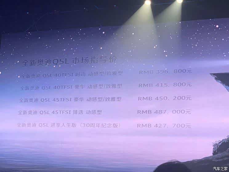 2021年5月28日,新款国产 奥迪Q5L正式上市,新车共推出8款车型,并包含一款30周年纪念版车型,售价区间为39.68-48.70万元,新车定位于中型SUV。动力上,依然搭载2.0T低高功发动机。
