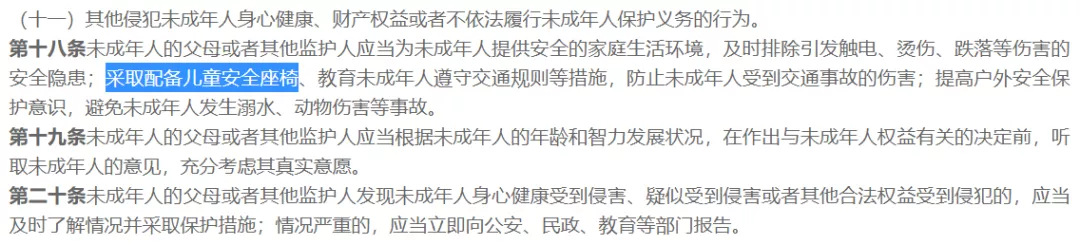 新未成年人保护法第十八条明确规定,监护人应“采取配备儿童安全座椅、教育未成年人遵守交通规则等措施,防止未成年人受到交通事故的伤害”。