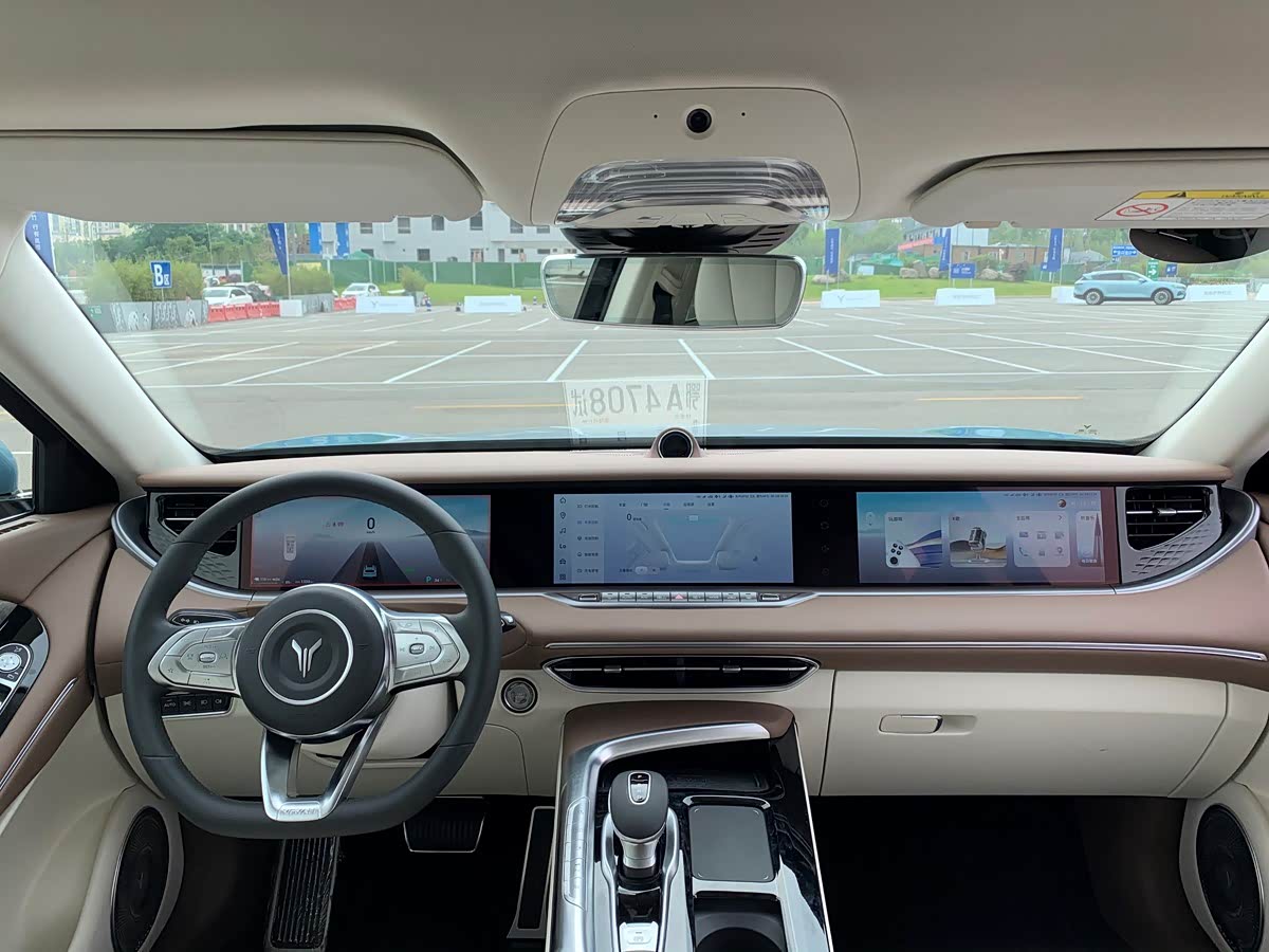 进入车内,首先吸引眼球的肯定是可升降的一体式三联屏,驾驶侧屏幕显示的是包括速度、SOC电量、纯电续航里程等常见车辆信息;中间屏幕更多的是车辆的设置,包括导航、倒车影像等等;右侧屏幕更多的是娱乐系统。