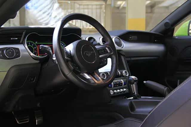 进入内饰,福特野马标志性的中控台布局没有变化,扑面而来的依旧是浓郁的美式粗矿风格,处处是展现力量感的设计。方向盘握感饱满,皮质工艺很细腻,摸上去手感很好。