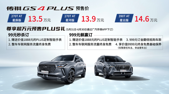 据悉,新车预售期间,通过广汽传祺APP下订即可尊享超万元预售PLUS礼。“99元秒杀订”和“999元躺赢订”两种下订方式,其中“99元秒杀订”可获赠价值1888元定制智能手表一只以及全网流量终身免费待遇。“999元躺赢订”在包含99元秒杀订福利的基础上,额外获赠999元订金翻倍抵扣车款,首任且非营运车主还可以享受价值9999元终身免费基础保养政策。以上政策及权益需用户在5月31日-6月30日18:00前在广汽传祺APP完成下订,并且在8月31日前完成购车方可享受。
