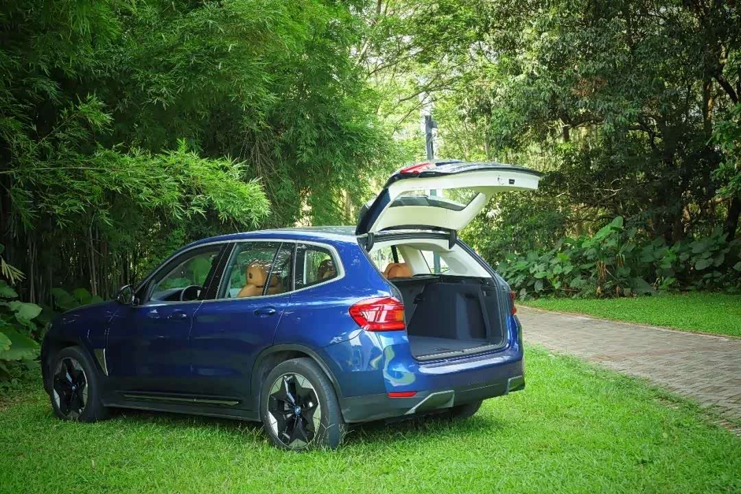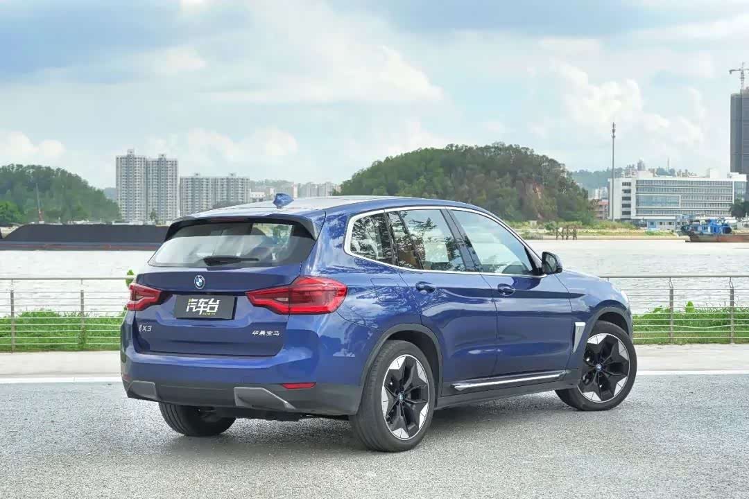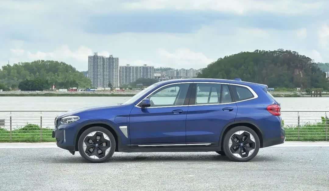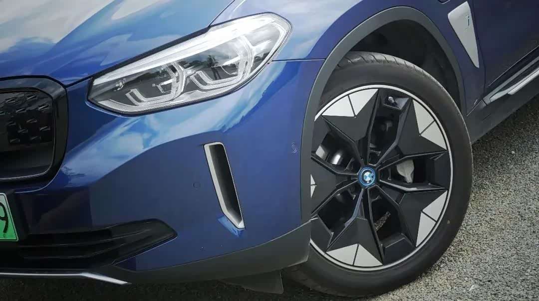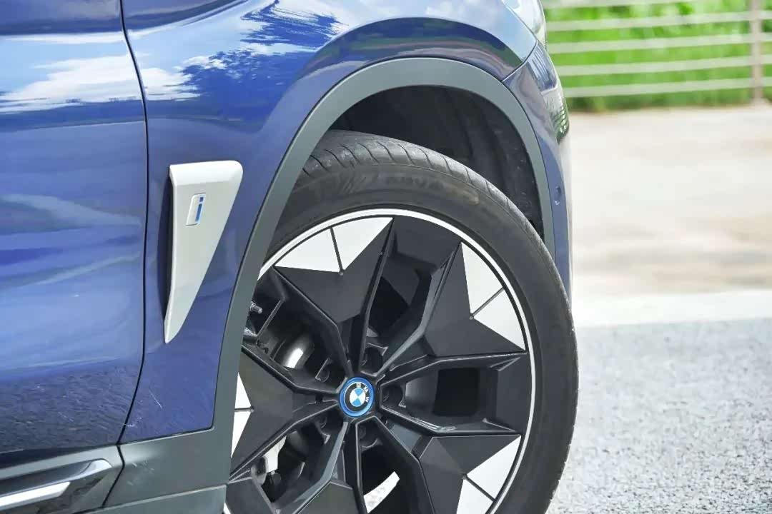 侧面比较独特的地方还有它的车轮,这也是经过空气动力学优化的结果,前翼子板后方的i字幕徽章时刻提醒你,这不是一部燃油版的宝马X3。