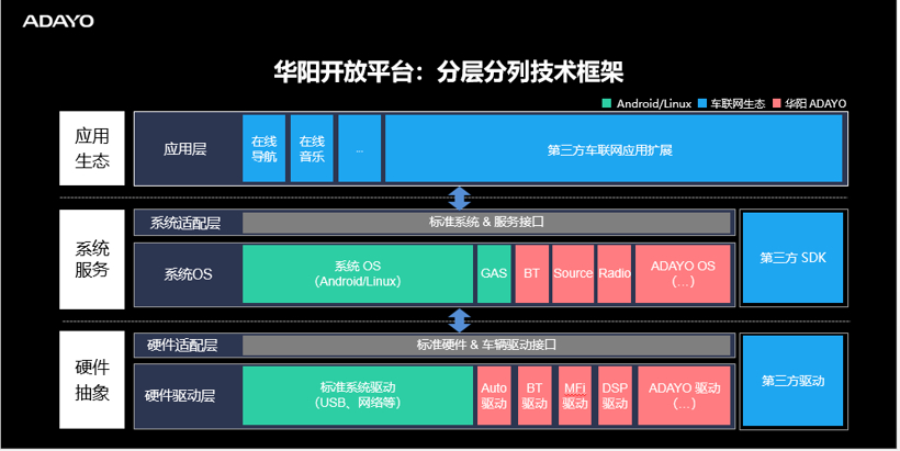 除了与生态伙伴建立战略合作外,华阳还于2020年推出了开放平台AAOP(ADAYO Automotive Open Platform,简称AAOP)。AAOP采用分层分列架构,一方面,分层实现了开放平台对底层硬件和上层应用的解耦,既可以灵活配置多类芯片,又可以自由选择多种应用生态。另一方面,分列可以实现对众多主机厂定制需求的解耦,即开放平台为主机厂提供了第三方适配接口。华阳开放平台大大降低了开发难度和提高了适配效率。曾仁武表示,“推出开放平台,就是让大家发挥各自优势,协同行业共同发展。”据了解, 基于华阳开放平台,目前已适配市场主流的车联网系统,如阿里斑马、腾讯车联TAI、讯飞飞鱼、梧桐车联PAI、华为HiCar等。
