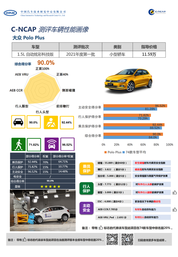 从公布的结果来看,上汽大众Polo Plus乘员保护评价得分为64.711分,得分率为92.44%,行人保护评价得分为10.773分,得分率为71.82%,主动安全评价得分为14.478分,得分率为96.52%,而在“对车外行人腿部的保护效果”和“车对车自动刹车能力”这两项测试中,上汽大众Polo Plus甚至能达到在当前测评版本全部车型中排名前20%的水平。根据各部分得分率乘以各自权重系数后求和,求得综合得分率为90.0%,达到了C-NCAP的“五星级”标准。
