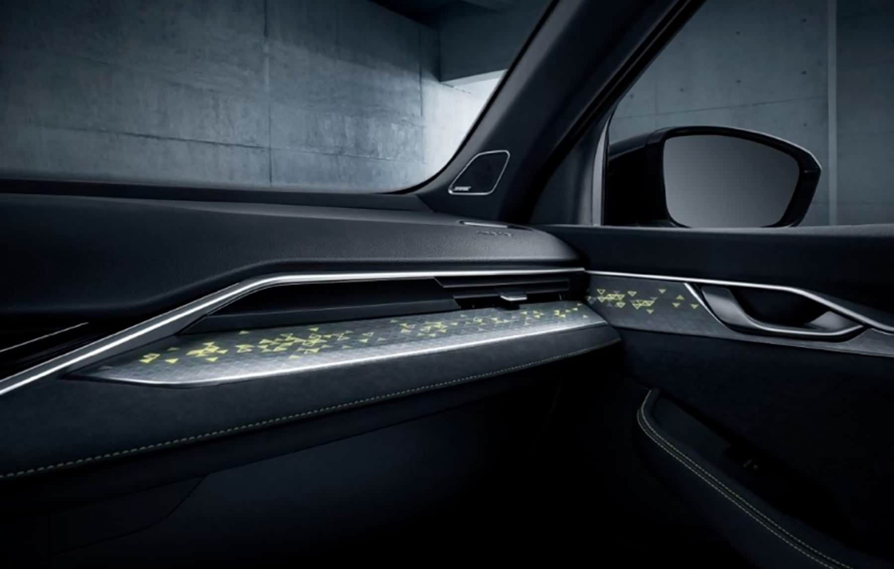 内饰配色以黑色为主,搭配镀铬条进行点缀,中控台、车顶以及门板等位置还覆盖有Alcantara材质,并辅以极光绿缝线进行装饰,有效增加了档次感。而且中控饰板和车门饰板中加入了星河镭雕3D设计,让内饰风格更加精致。