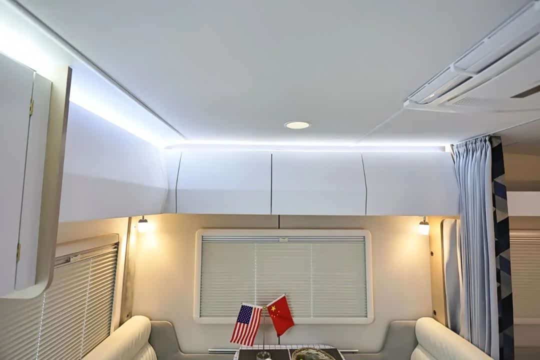 车内相比车外的设计亮点就更多了,在家居的营造上,整体为欧式风格。黑白的配色与原木风格家具,看起来更加年轻。相比进口拖挂的设计来说,这款车没有采用主灯设计,内部运用了很多隐藏的灯带,来提升车内的照明亮度以及视觉效果。