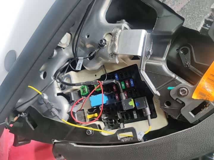 拆开仪表台侧面的饰板,虽然内部的保险丝盒有加装线路,但泡水的情况没有出现。