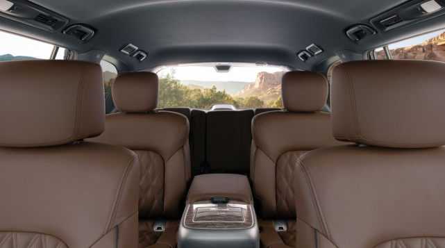 在空间方面日产Armada表现也非常不错,虽然是标准8人配置,但是空间丝毫不觉得拥挤,高配版的第二排则是配备了皮革包裹实木装饰的小桌子,将8人配置降低到7人。在后排配备的娱乐系统也比较丰富,每个前排枕头下面都有一块8英寸的屏幕,不管是驾驶还是乘坐,都可以享受这款日产Armada带来的豪华气息。