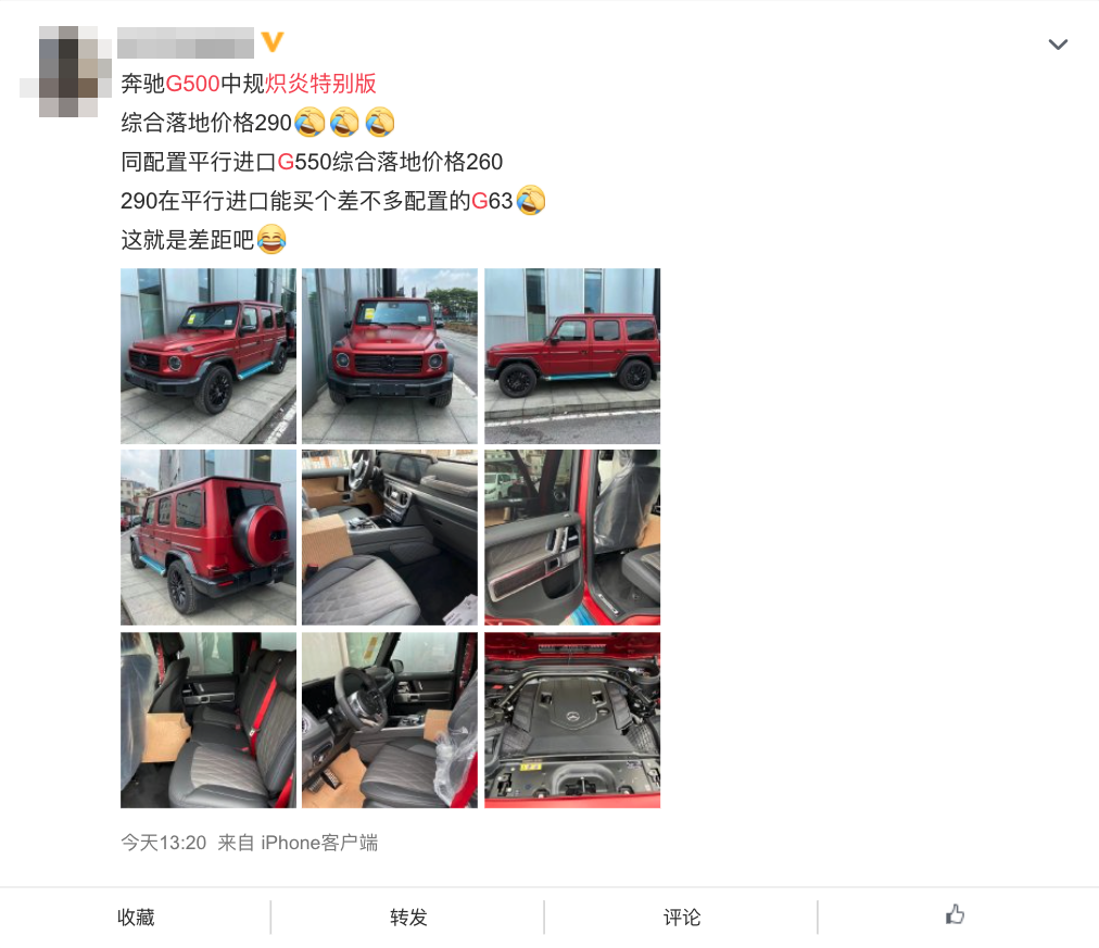 近日,我们从某社交平台上看到了一组中规 奔驰G 500炽炎特别版的实车图片,据悉新车将于6月底公布售价,限量500台,有望在8月开始交车。