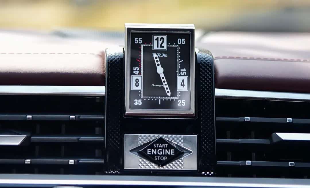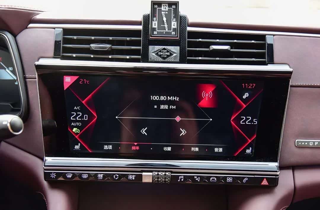 内饰的设计同样是非常的有个性,充满了法国那种浪漫奢华的感觉,在市面上你绝对找不出第二家。首先就是中控上方的那块可翻转的钟表,车辆在没有通电的时候,那块表是收起来的,你是看不到的。等你车一通电,那块表就会慢慢的翻出来,仪式感爆棚。然后就是这个车的一键启动按键,跟市面上所有的车都不一样。他把这个启动按键放在了中控上方,也就是上面所说的那块表的下方。然后启动方式也不一样,这个键你需要长按两三秒,车辆才能够启动,熄火同样也需要按两三秒。