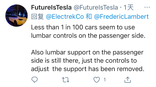 更有特粉强调:特斯拉并没有取消副驾的腰托功能,只是不能再调节了而已。