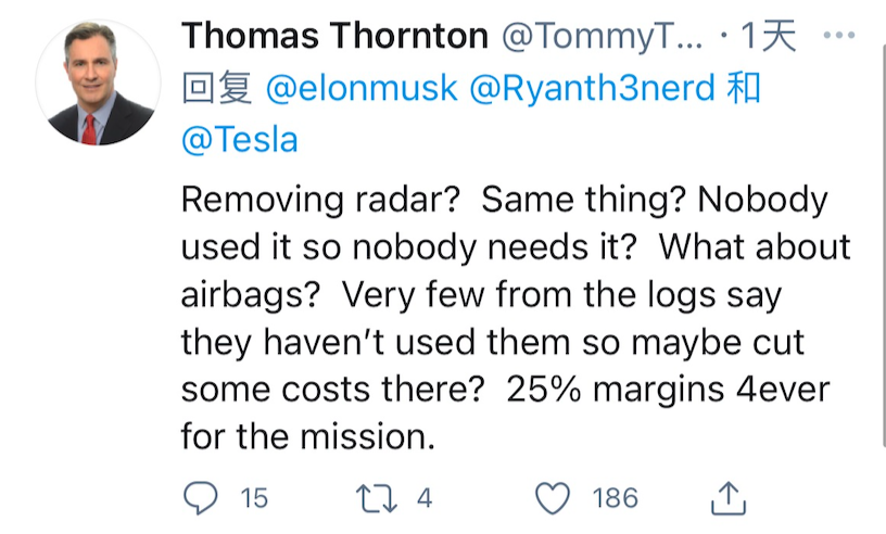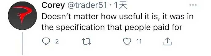 一个叫Thomas的网友直接讽刺:那去除雷达也是同样原因了?因为用的少就说没人需要它?那安全气囊也可以去掉了?