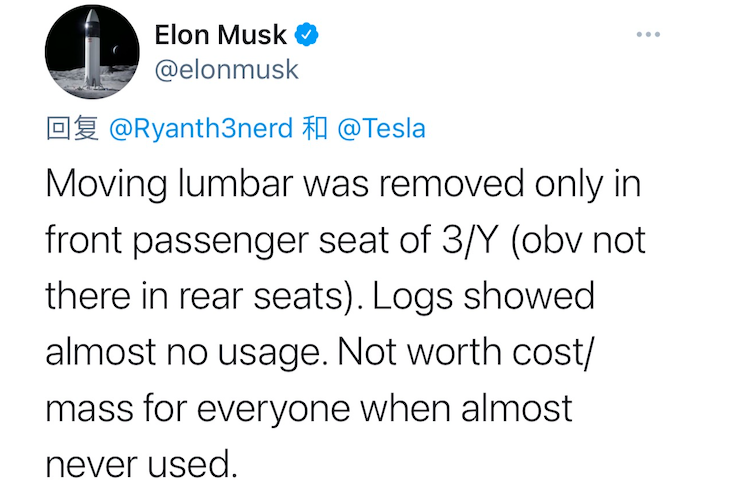 接着,Elon Musk又在社交媒体做了解释:腰托调节功能确实从新款Model 3和Model Y的副驾座椅上移除了,因为行车日志显示,很少有人用到这个功能。当人们都不怎么用到一个配置时,不值得让每个人去承担成本和重量。
