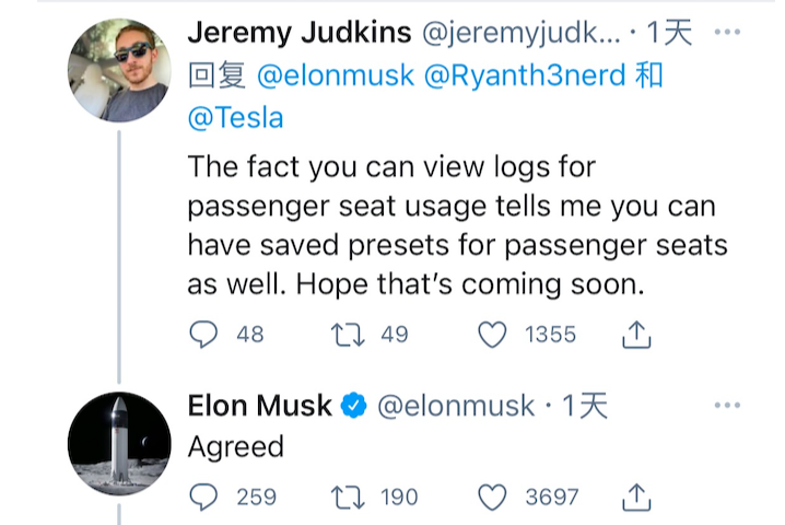 比如一位叫Jeremy的网友说:其实可以通过观看行车日志,来决定副驾的最佳设置,然后保存成不同的「预设」,用电子手段解决这个问题。