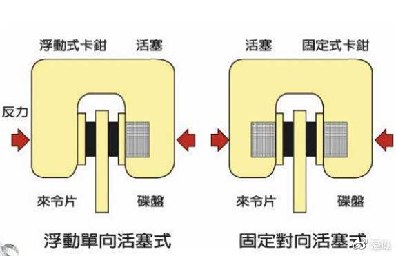 刹车卡钳的设计,主要可以分为单活塞卡钳和多活塞卡钳,大多数原厂配置的卡钳都是单向式活塞的组合,其另外一侧的刹车片是依靠卡钳的反作用力来推挤,因此又有一个名称,叫做“浮动式卡钳”。这种设计的主要缺点是,在紧急刹车的情况下,本来呈现“门字型”的卡钳会往两边弯曲发生形变,瞬间发力效果极差,往往需要再次施加压力才能达到最大制动效果。