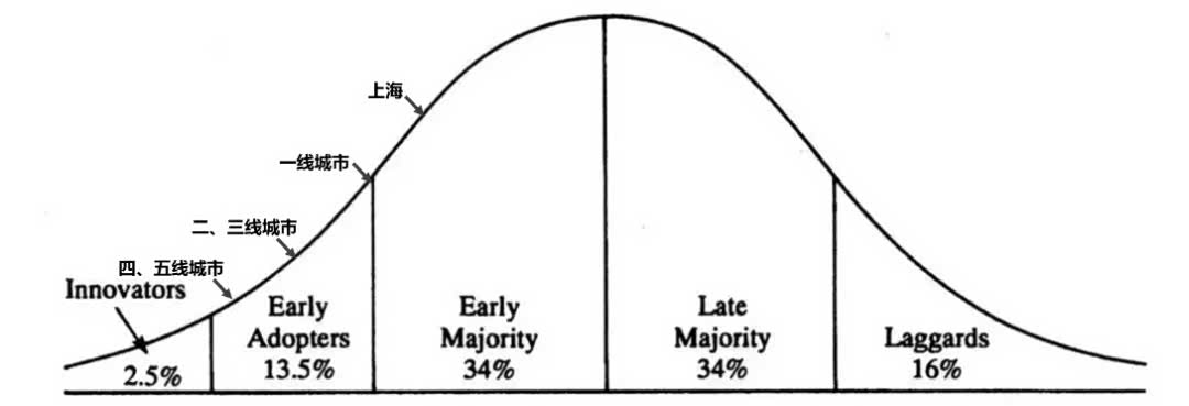 我们把不同城市的电动车渗透率放入创新扩散曲线中,上海市已经跨入早期大众(Early Majority)阶段,电动车已经开始为大众接受,而一线城市总体刚跨过早期采用者(Early Adopters)阶段,正准备为更普遍的大众接受,其他级别城市则还处在早期采用者(Early Adopters)阶段。