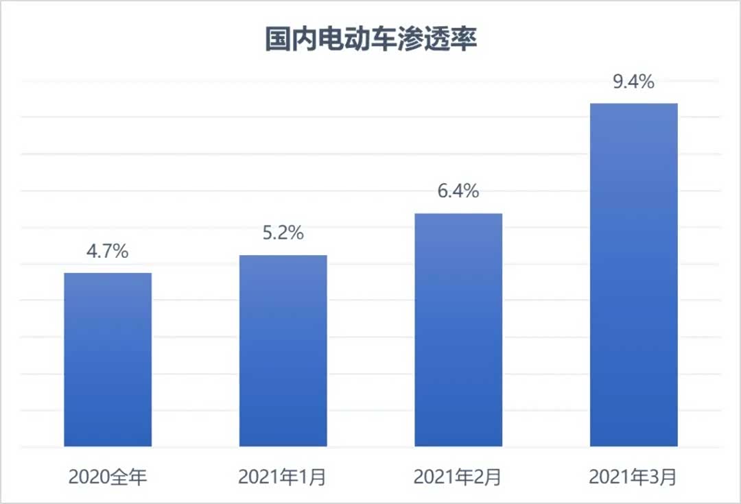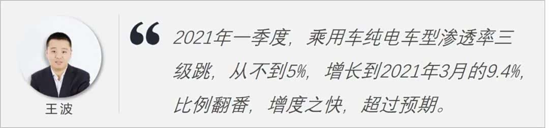 2020年,乘用车纯电车型的渗透率为4.7%;2021年一季度,渗透率便三级跳,从不到5%,增长到2021年3月的9.4%,比例翻番,增长速度之快,超过预期。