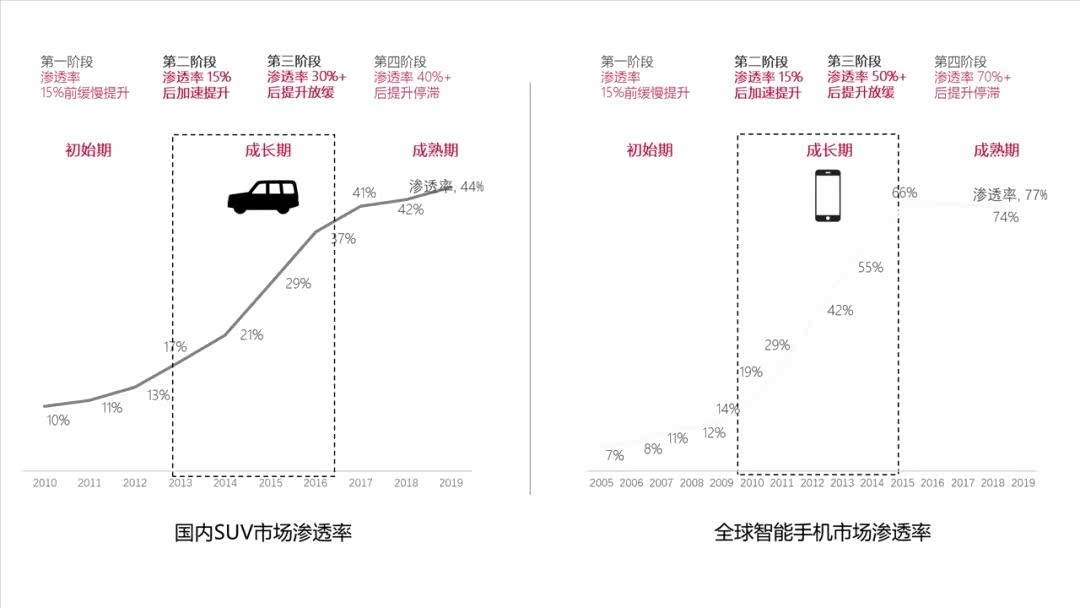 有观点说智能电动车还是汽车,有观点说智能电动车是消费电子产品。不管是前者还是后者,仔细观察国内SUV市场渗透率,全球智能手机市场渗透率的发展趋势,可以发现,两者都在渗透率达到15%左右的时候进入极速增长的阶段。这也就是我们说15%是腾飞门槛的原因。