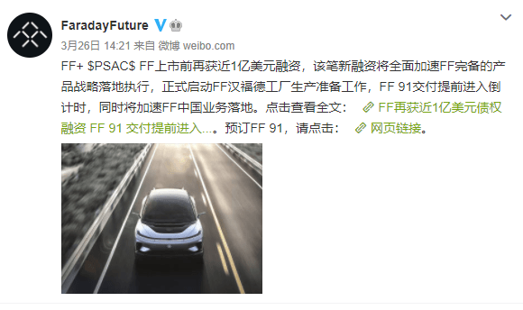 有观点认为,无论是FF 91量产交付,还是销售渠道布局,FF能否顺利登陆资本市场都是前提条件。在今年1月获得一笔7.75亿美元超额认购后,FF和PSAC曾表示,该资金将用于FF 91的大规模量产和交付。
