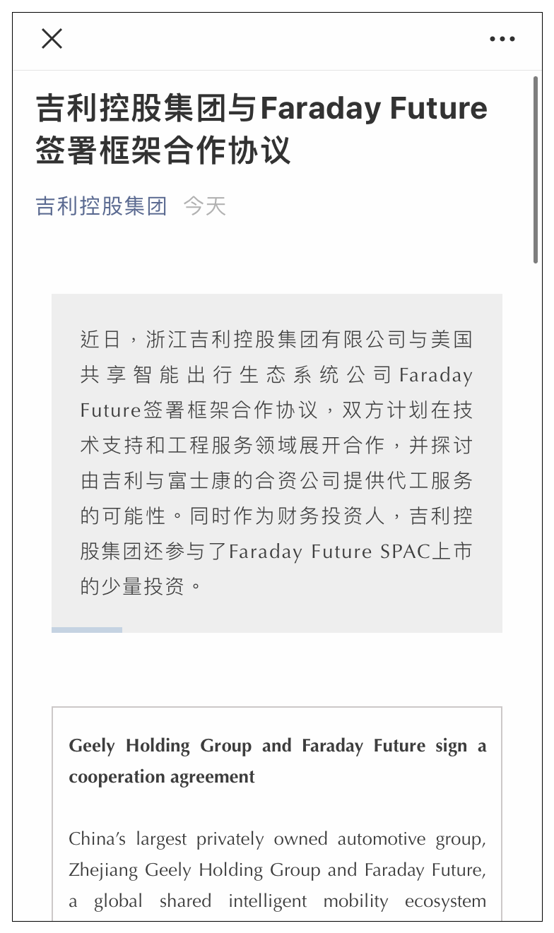 吉利也在今年加入FF的“朋友圈”。1月29日,吉利控股集团发文称,作为财务投资人参与FF SPAC上市的少量投资,同时提供人才和技术,并探讨由吉利与富士康的合资公司提供代工服务的可能性。