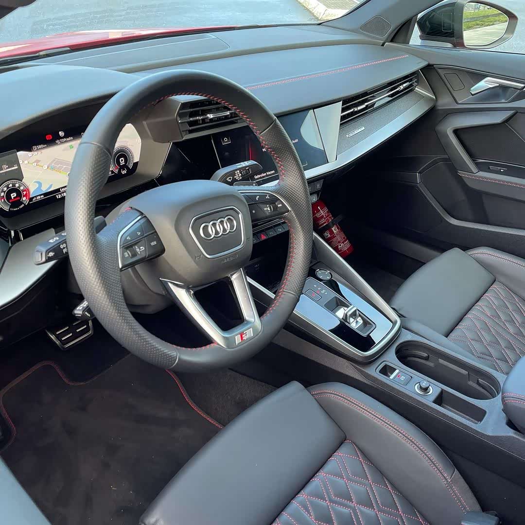 内饰方面,全新奥迪S3和普通版车型并没有太大不同,依然是最新的设计和布局,配备了10.25英寸全液晶仪表盘、10.1英寸内嵌式中控多媒体触摸屏、带换挡拨片的三辐式平底运动方向盘以及拨杆式的电子换挡机构,不仅科技感十足,而且充满了档次感。